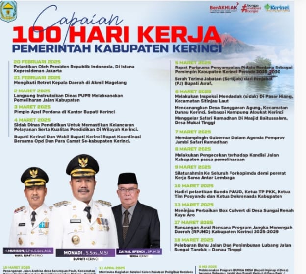 Genap 100 hari kerja, duet kepemimpinan Bupati Monadi, S.Sos., M.Si dan Wakil Bupati H. Murison, S.Pd., S.Sos., M.Si menunjukkan langkah nyata membangun Kabupaten Kerinci. Sejak dilantik pada 20 Februari 2025 oleh Presiden RI di Istana Negara, keduanya langsung menunaikan berbagai program prioritas untuk menjawab kebutuhan dasar masyarakat.