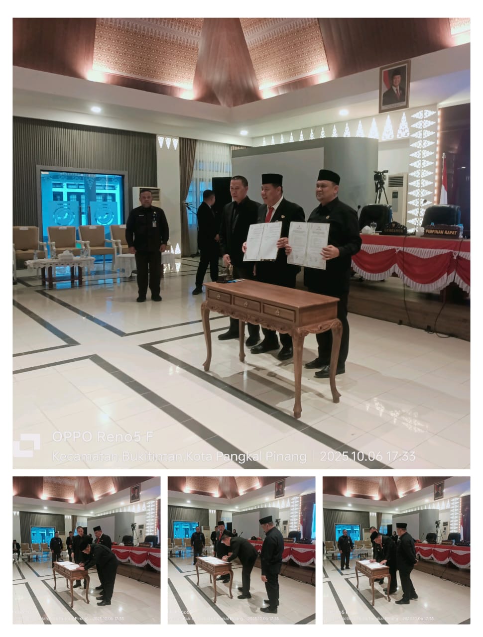 Usai seluruh fraksi menyampaikan pandangan akhir, pimpinan DPRD Babel bersama Gubernur Kepulauan Bangka Belitung menandatangani berita acara persetujuan bersama sebagai tanda sahnya Raperda RPJMD 2025–2030 menjadi Perda.