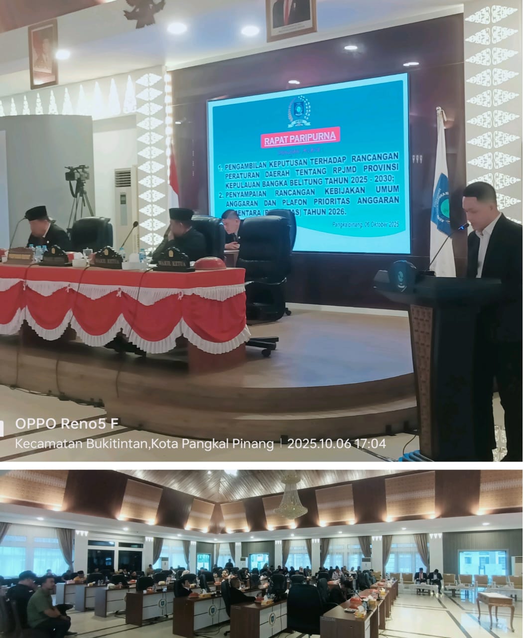 Persetujuan ini disampaikan dalam Rapat Paripurna DPRD Babel yang digelar di Gedung Mahligai DPRD, Senin (6/10/2025), dan dihadiri oleh Gubernur Kepulauan Bangka Belitung beserta jajaran Forkopimda, pimpinan OPD, serta tamu undangan lainnya.