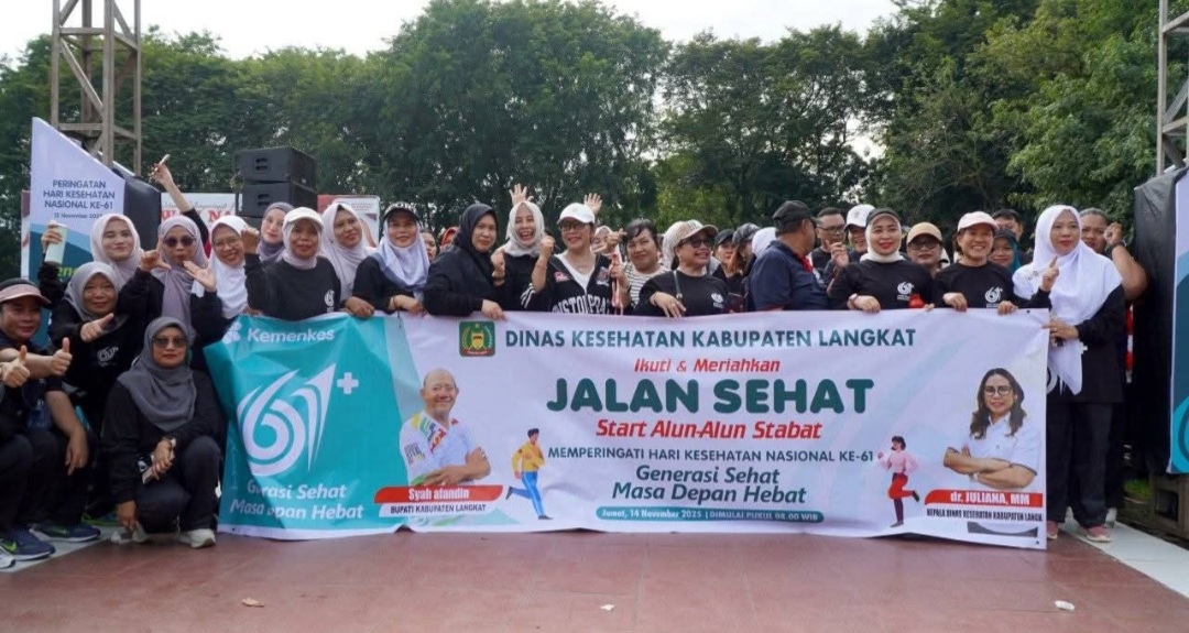 LANGKAT – Peringatan Hari Kesehatan Nasional (HKN) ke-61 Tahun 2025 di Kabupaten Langkat berlangsung meriah melalui kegiatan gerak jalan santai yang dipusatkan di Lapangan Alun-Alun T. Amir Hamzah, Rabu (19/11/2025).