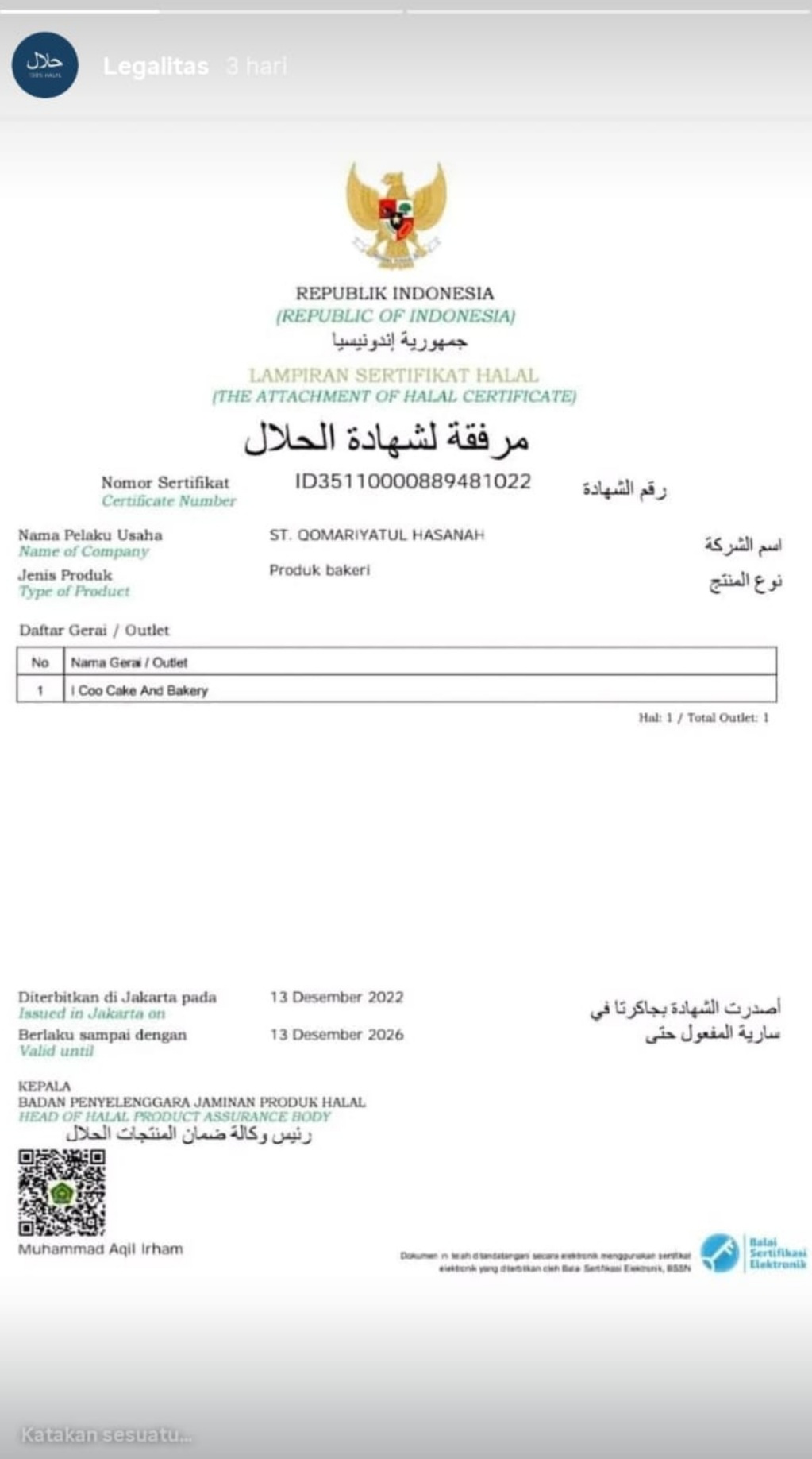 Kredibilitas usaha semakin terjamin dengan diperolehnya sertifikat halal dari Balai Sertifikasi Elektronik yang diterbitkan di Jakarta pada 13 Desember 2022 dan berlaku hingga 13 Desember 2026, yang ditandatangani oleh Kepala Badan Penyelenggara Jaminan Produk Halal, Muhammad Aqil Irham.
