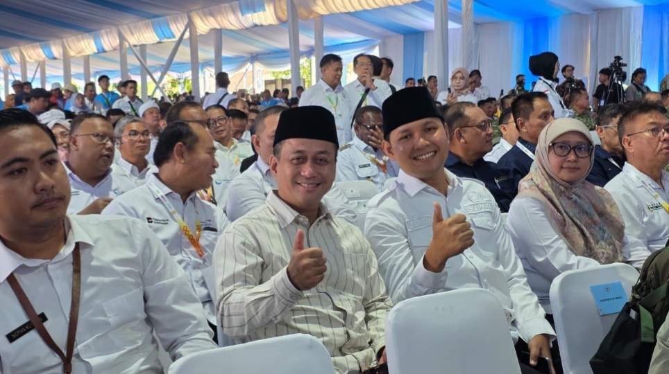 Bupati Tasikmalaya, H. Cecep Nurul Yakin dan Bupati Karawang, H. Aep Syaepuloh saat menghadiri acara Panen Raya dan Pengumuman Swasembada Pangan di Kabupaten Karawang, Rabu (07/01/2026).