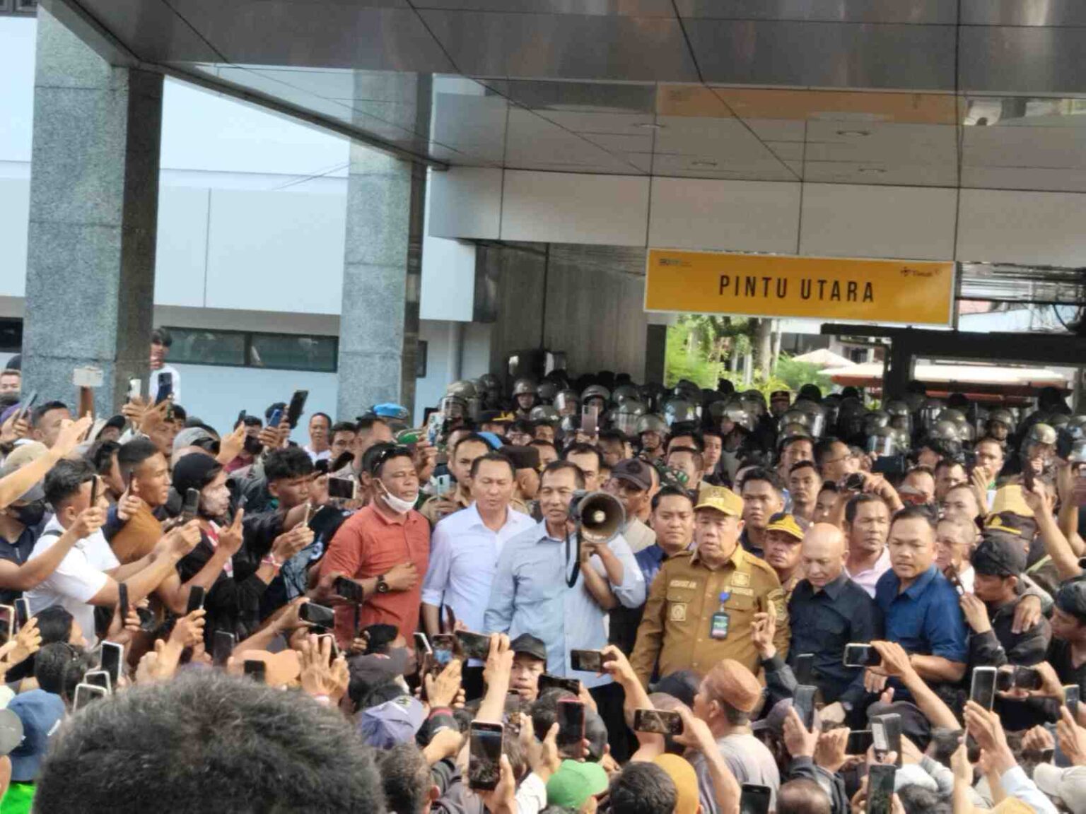 PANGKALPINANG — Ketua DPRD Provinsi Kepulauan Bangka Belitung (Babel), Didit Srigusjaya, turut mendampingi Gubernur Babel Hidayat Arsani dan Direktur Utama PT Timah Tbk Restu Widyantoro dalam menerima aspirasi ribuan penambang yang berunjuk rasa di Kantor PT Timah Tbk, Senin (6/10/2025).