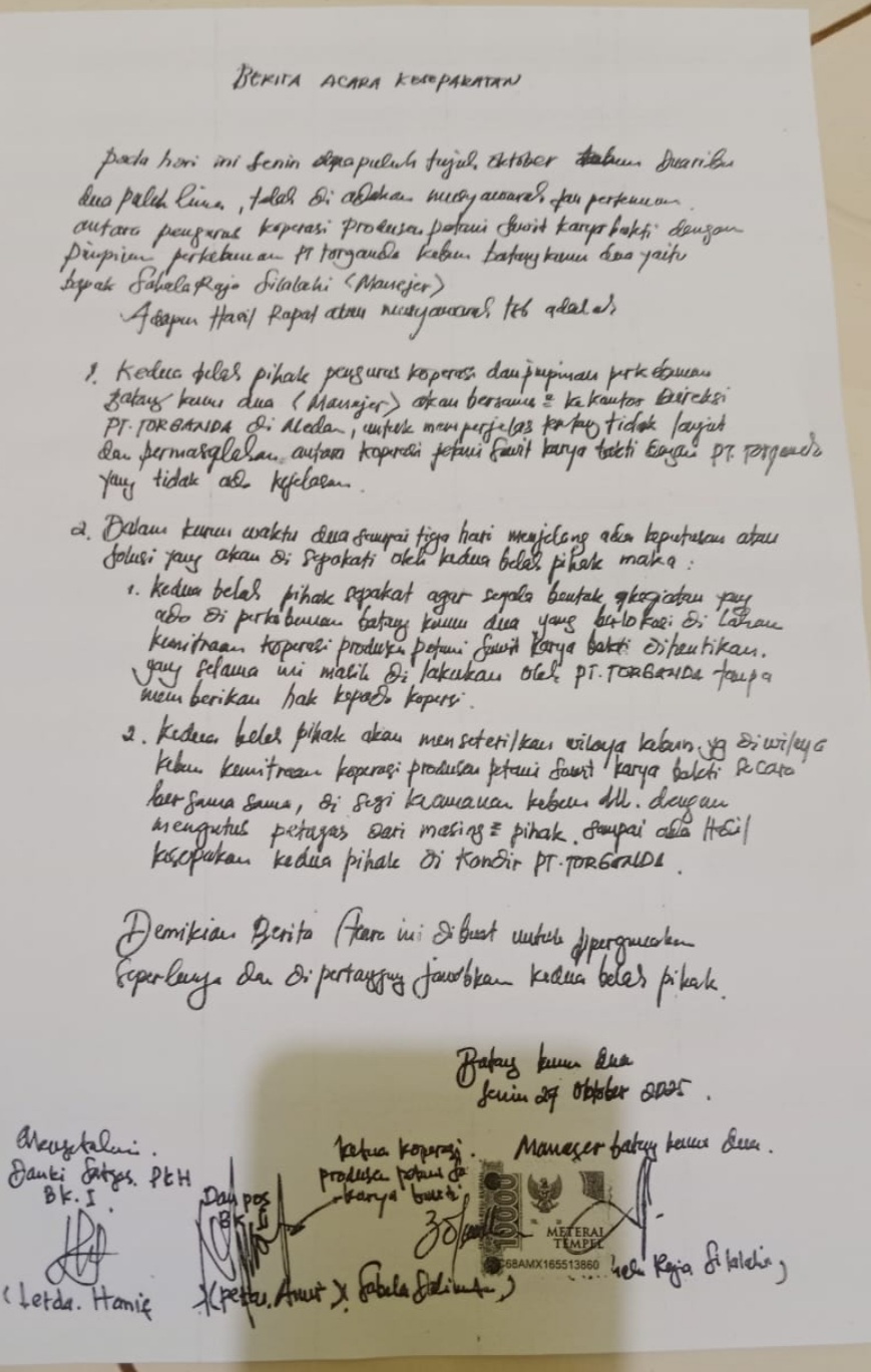 Lebih lanjut Irwan mengatakan, sesuai dengan berita acara yang disepakati antara pihak koperasi dan PT Torganda dalam tempo 3 hari pihak PT tidak ada memenuhi kesepakatan yang tertulis di berita acara kesepakatan, maka R Silalahi tidak berhak mencegah anggota koperasi melakukan aktivas di areal wilayah kerja koperasi tersebut.