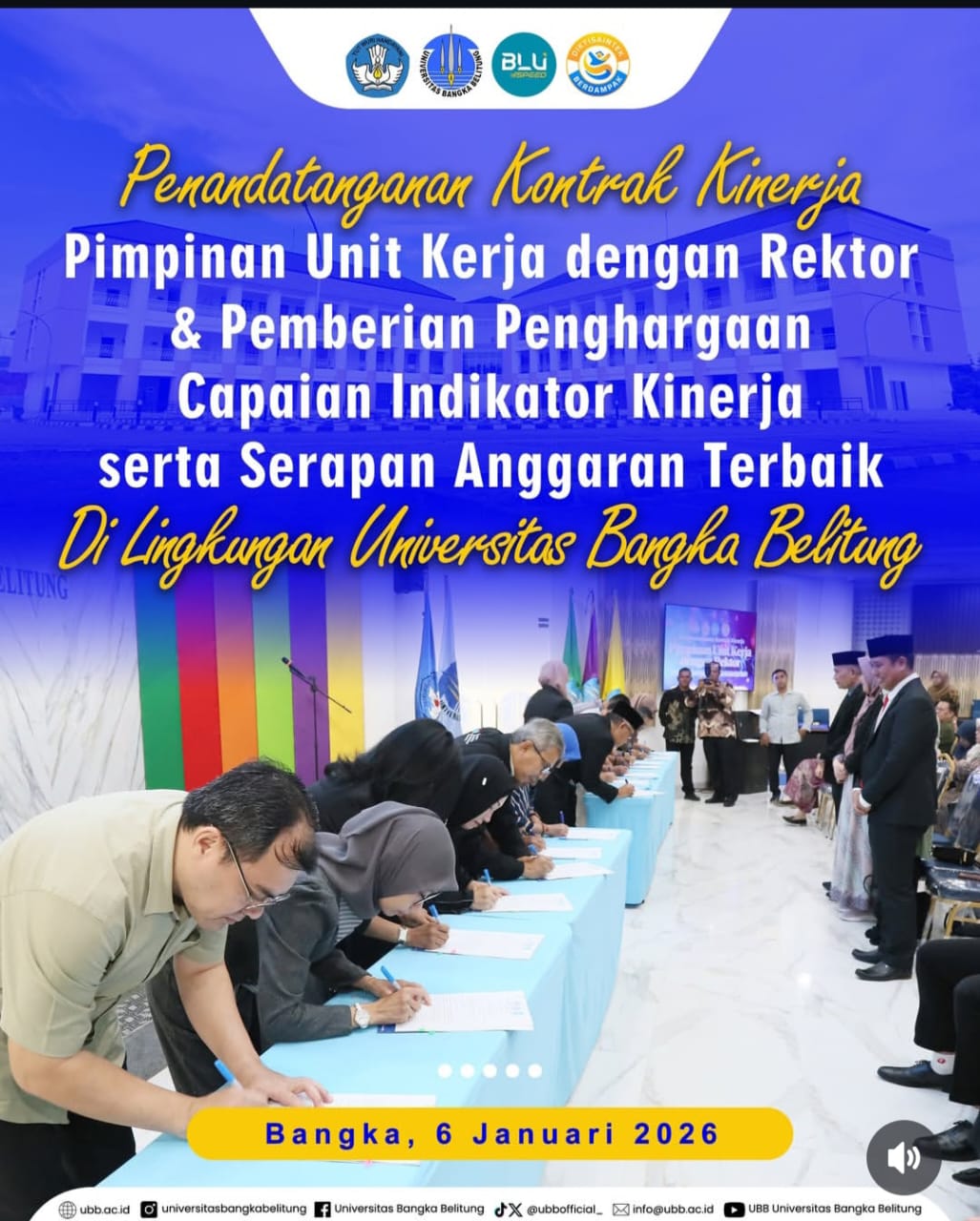 Pangkalpinang — Universitas Bangka Belitung (UBB) menegaskan komitmennya dalam meningkatkan kinerja institusi menuju keunggulan akademik dan tata kelola yang berdampak bagi masyarakat pada tahun 2026. Komitmen tersebut ditandai dengan Penandatanganan Kontrak Kinerja Pimpinan Unit Kerja bersama Rektor UBB, yang digelar pada Senin, 6 Januari 2026.