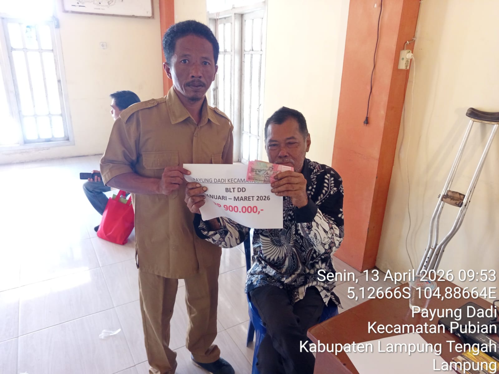 Pemerintah kampung payung dadi kecamatan pubian kabupaten Lampung tengah menyalurkan Bantuan Langsung Tunai Dana Desa (BLT-DD), insentif kader posyandu, serta Pemberian Makanan Tambahan (PMT) posyandu di balai kampung, Rabu (15/4/2026).