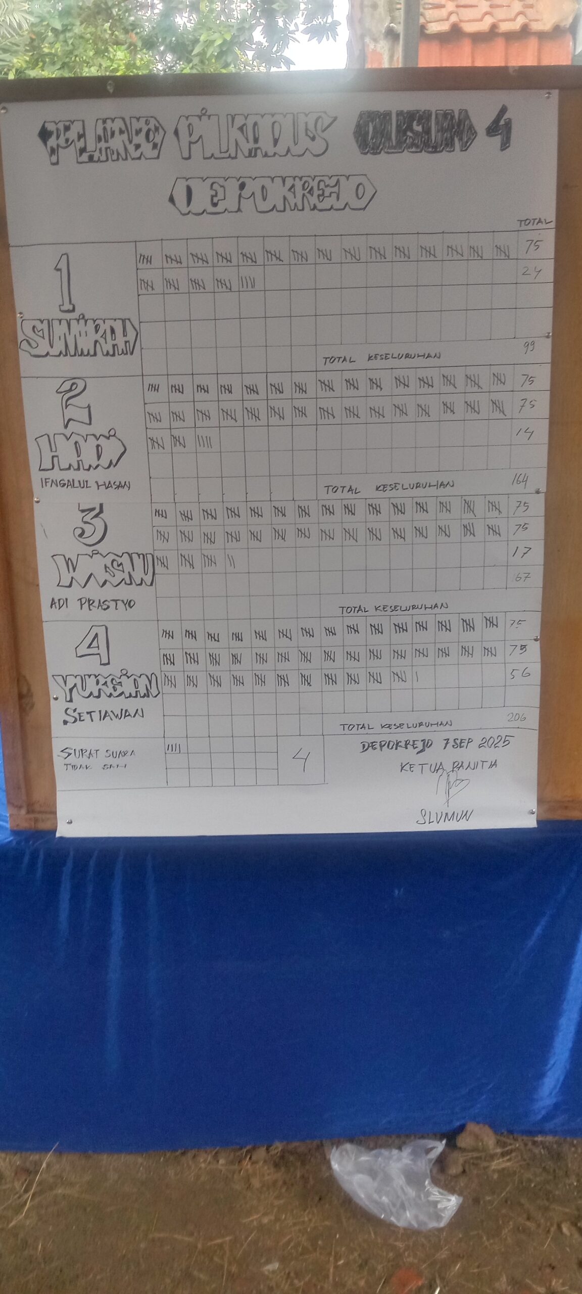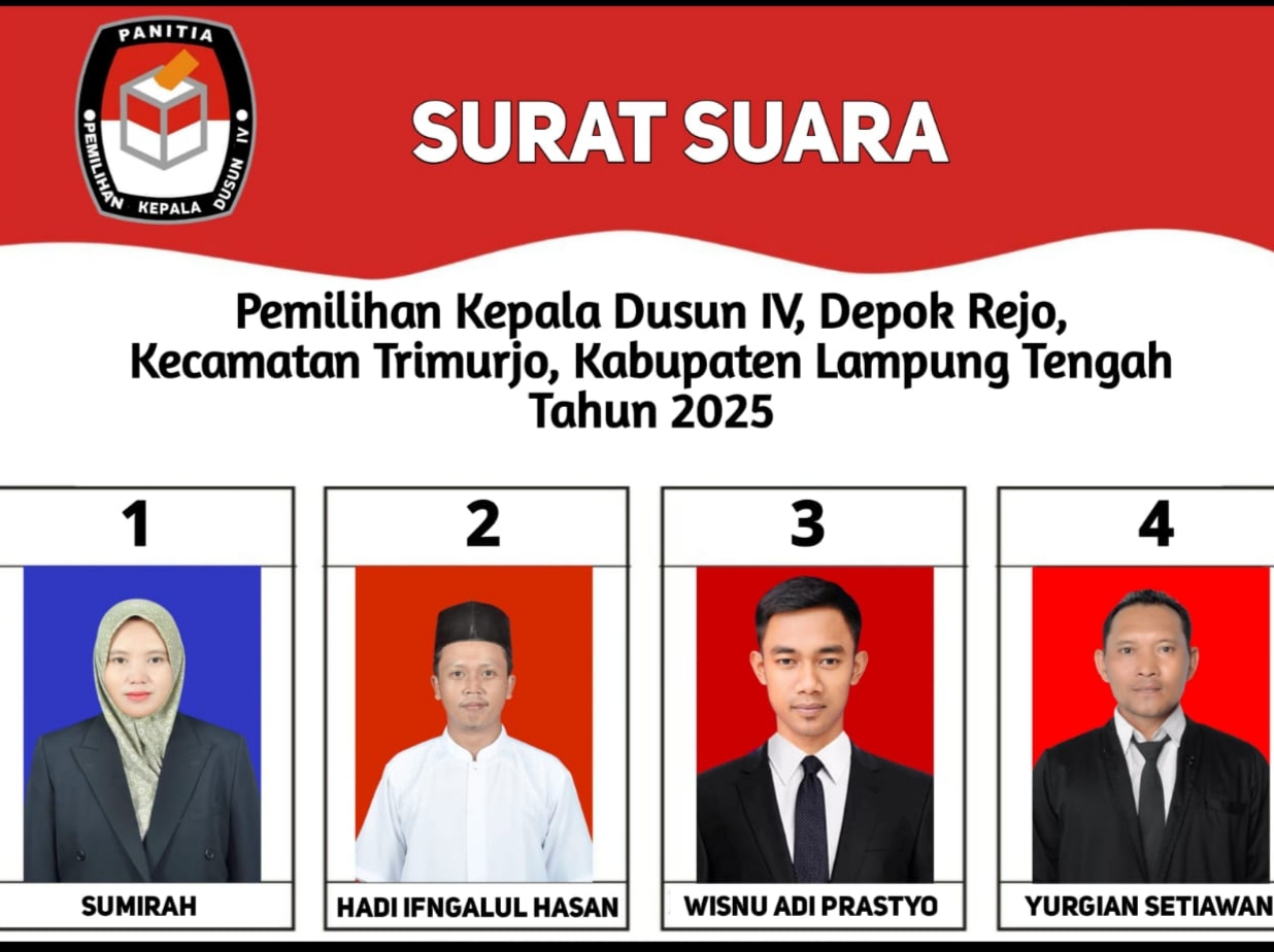 giat Pilihan Kadus 4 pada kampung Depokrejo ini,mengacu pada keinginan warga yang telah kita sepakati melalui Musyawarah Dusun, sehingga terbentuk panitia pemungutan suara secara langsung untuk Kepala Dusun 4 Kampung Depokrejo kecamatan Trimurjo ini tukas nya.