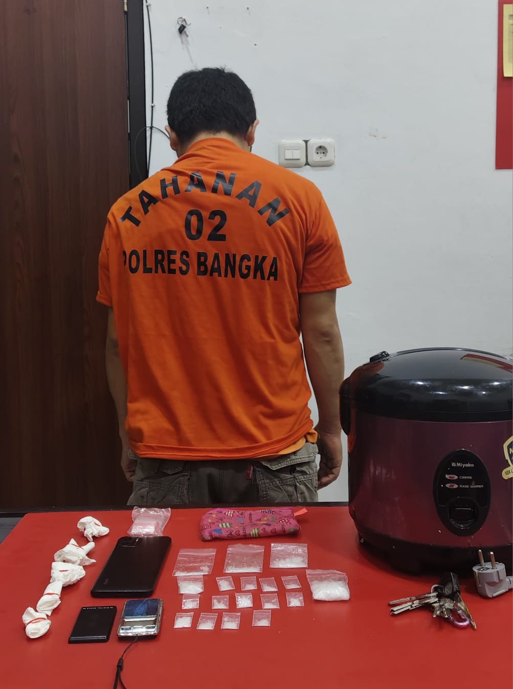 Dalam pengungkapan tersebut, petugas mengamankan seorang pria beserta sejumlah barang bukti narkotika siap edar dengan total berat bruto mencapai 18,42 gram.Penangkapan dilakukan di pinggir Jalan Melati, Kelurahan Parit Padang, Kecamatan Sungailiat. Pelaku diketahui bernama FS alias Surya (42).