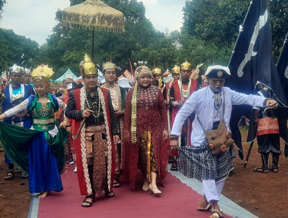 Di sepanjang jalan tersebut Kepala Desa Kemang H. Entang Suana SE., istri Hj. Yeni Rahmawati dan putranya diarak menunggang kereta kencana dan dikawal siswa-siswi dari SMA Negeri 1 Kemang dengan dandanan kostum algojo dan angkatan perang kerajaan.