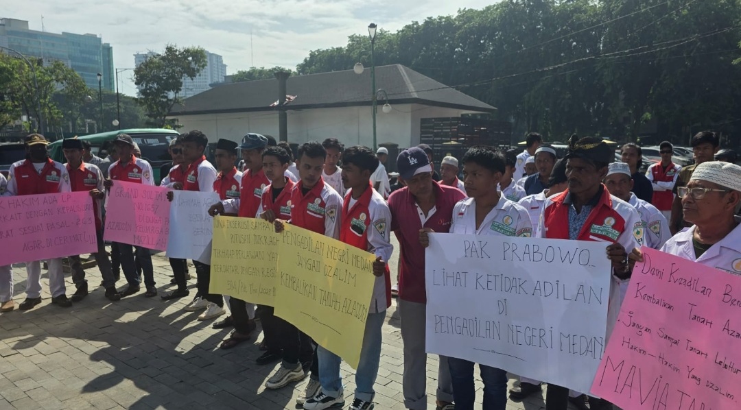 “Kembalikan tanah milik saudara kami Muhammad Nur Azaddin. Kami mohon kepada PN Medan agar menunda eksekusi sampai putusan Inkcrah,” tegas Koordinator Aksi yang juga Ketua DPW Mazilah Deliserdang, Syamsir Bukhori, Senin (14/7/2025).