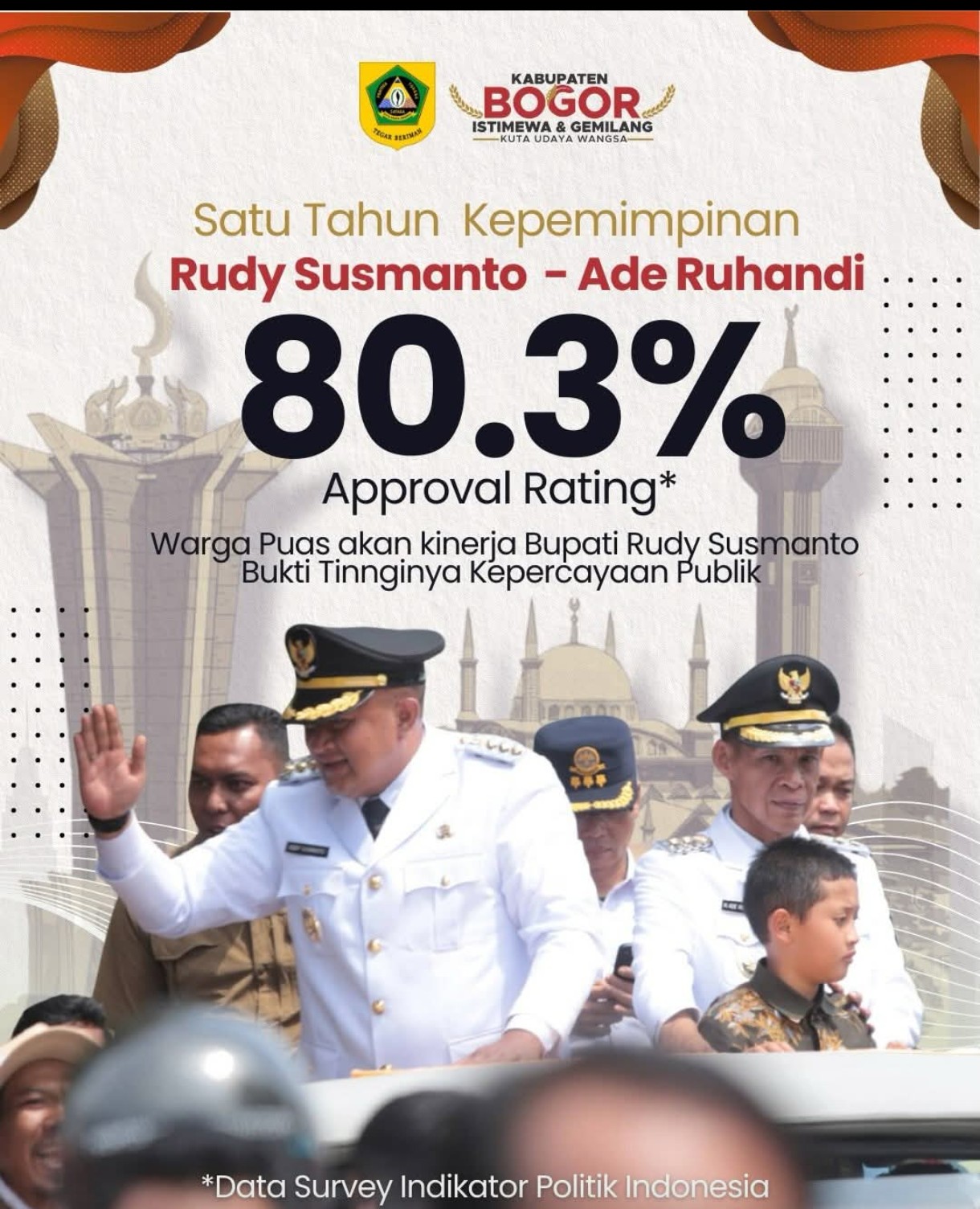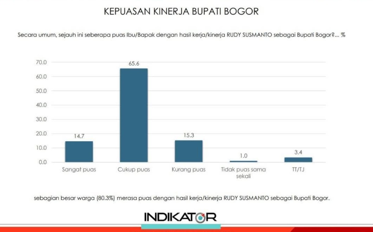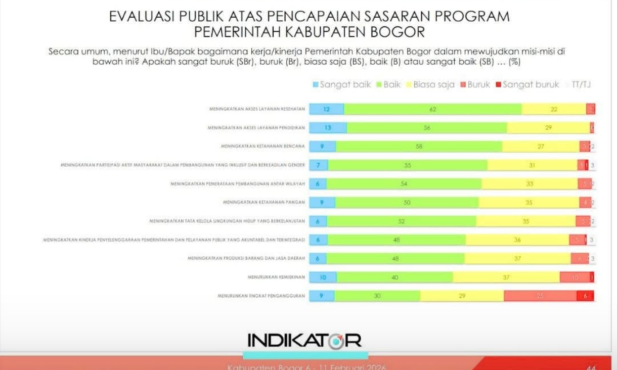 Lembaga survei Indikator merilis hasil evaluasi publik terhadap pencapaian sasaran program Pemerintah Kabupaten (Pemkab) Bogor untuk periode survei 6-11 Februari 2026 tingkat kepuasan (approval rating) masyarakat berada di angka 80,3 peraen untuk Bupati Bogor dan Wakil Bupati Bogor diangka 79,3 persen, melampaui ambang batas psikologis diatas 50 persen.